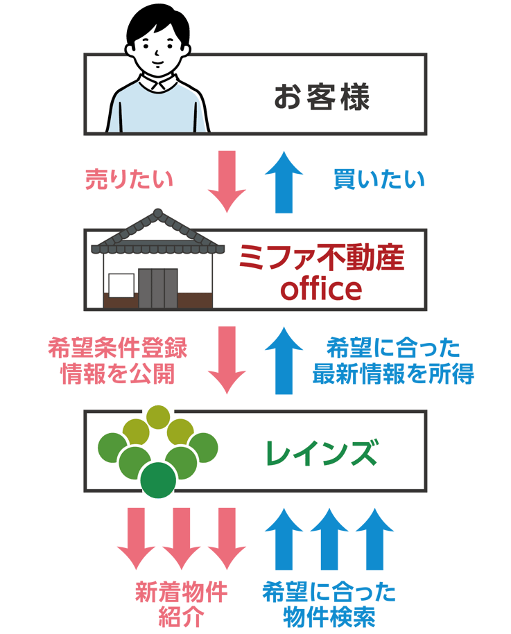 登録された情報は各社で共有されており、これにより、会社の規模に関係なく不動産情報を取り扱うことができますので、より広範囲に円滑な情報交換、お客様のニーズに応える不動産取引が可能となります。